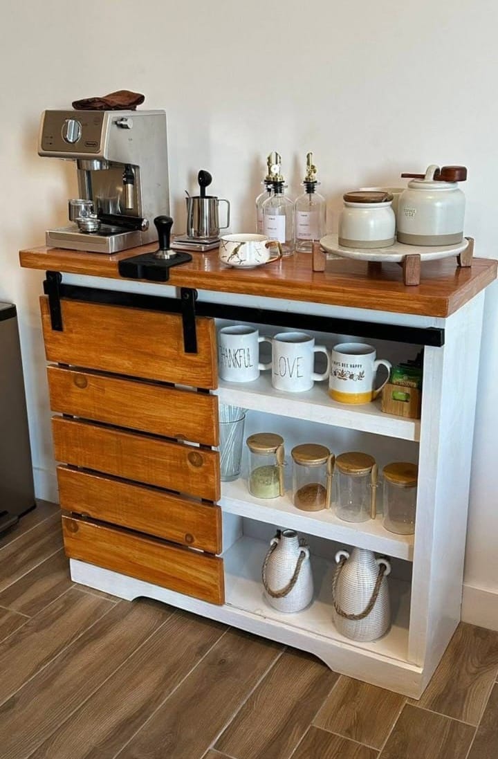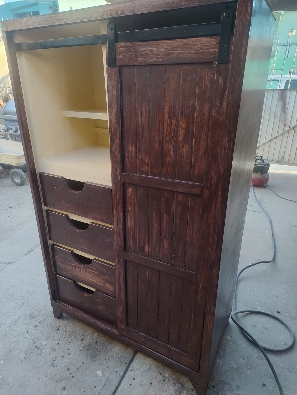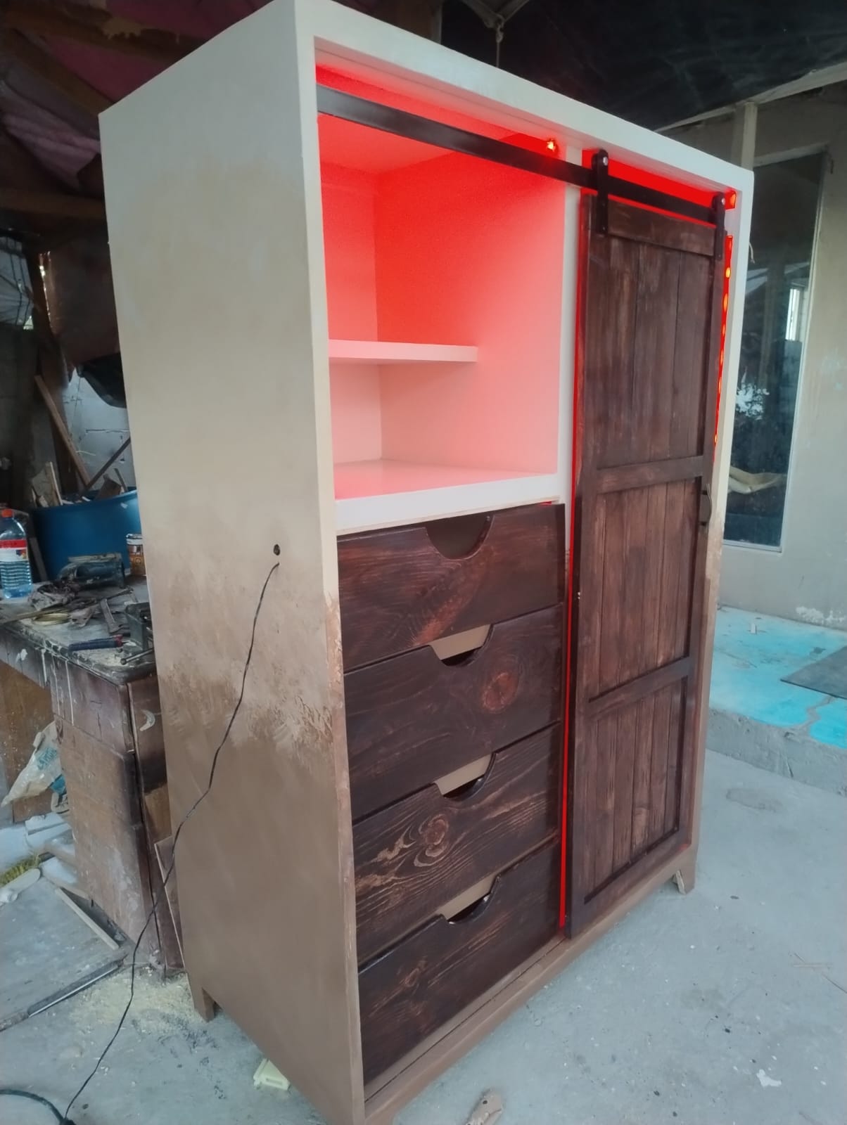 Ropero cafe y crema con luz led roja y puerta corrediza de 4 cajones